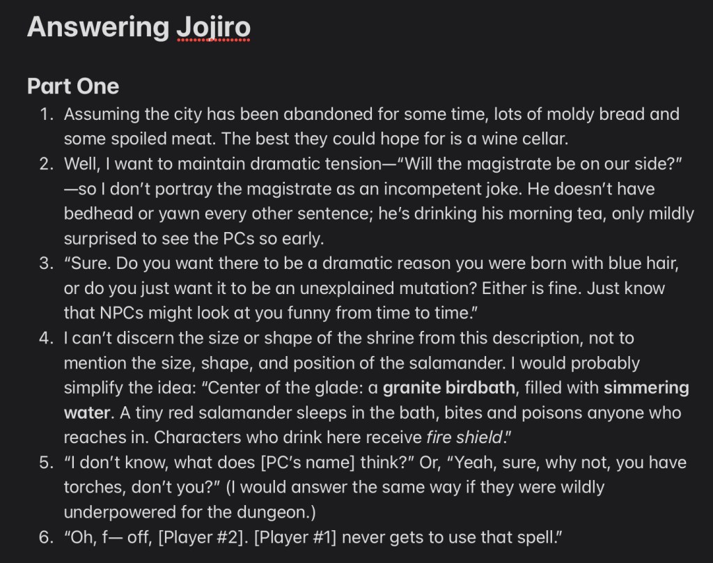 Traveling Mailman muses a bit for question #11 on how the Game Master might come across as a little mean, and muses on how tone is important when answering player questions. Gendernihilist has a delightful answer to #3, in which she gets the player directly involved in fleshing out the world’s canon in a spontaneous and fluid transition to collaborative worldbuilding. Tim B, who gave response to me in picture form…