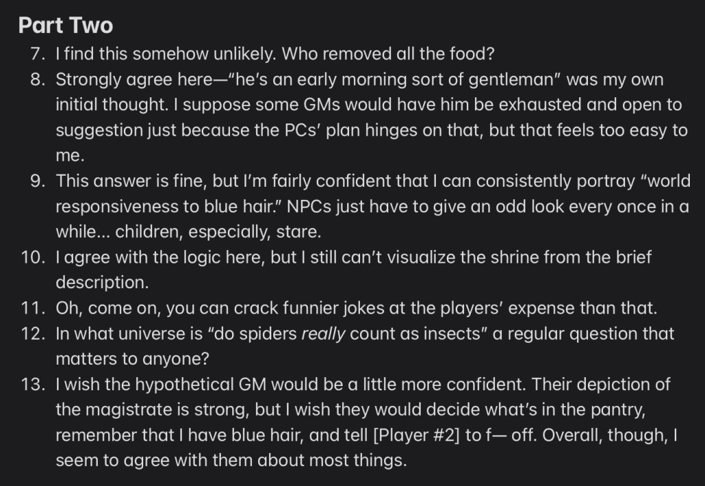 …has two fascinating thoughts – first, he actively tells Player 2 to “fuck off” in #6, which tells you just how strongly people can feel about these things! That’s very useful, I think, for a newbie GM to know and understand – you need to be ready to assert yourself when conflicts arise. And then, secondly, he comments in #10 that being unable to picture the shrine due to minimalism is an issue. Again, useful for a newbie GM to know – this is the sort of thing that your players are thinking about.